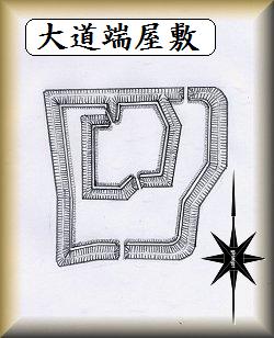 大道端屋敷は、内ヶ島団地の北側にあった。現在はアパートなどが建っていて完全湮滅となってしまった。そこで山崎一氏の図と古い航空写真を基にして想像図を描いてみた。二重の堀に囲まれた環濠屋敷であったようである。全体の規模は100m四方ほどであったろうか。