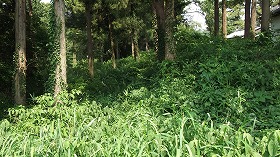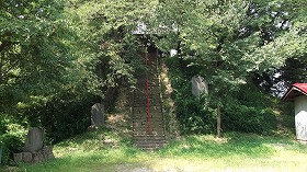 | 鳥山館東側の土塁跡。 | 鳥崇神社。周溝墓を利用したもので、西側には堀の跡が残っている。 |