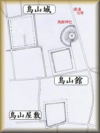 鳥崇神社は周溝墓を利用したものなのであろうか。高台となっているうえに、周囲に堀跡が見られる。これは物見台として利用されていた可能性があると思う。その南の鳥山館は、周囲に土塁跡と思われるものが現在も残っている。70m四方ほどの規模であったと思われる。