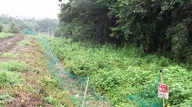| 小学校との間にある堀跡。 | 小学校の側にある案内板2。ヤブで埋もれてしまっている。 |