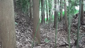道の脇に車を停めて、作業道を登り始める。しかし、こちらもすぐにヤブになってしまっていて、とてもではないが城址まで到達できそうにない。そこで、道を進むのはあきらめて、その辺りから山の斜面を直登することにした。