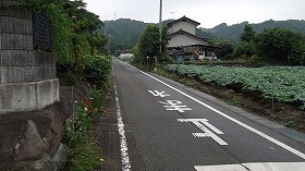 アクセス方法であるが、地形図を見てみたら、東側の山稜付け根の付近を林道が通っている。この林道から尾根伝いに進んでいけば、たいして登ることもなく城内に入れそうである。というわけで、山稜付け根からのコースを選択することにした。林道と言っても舗装されたちゃんとした車道なので、運転するのにも不安がない道である。すると、予定通り、基部部分に到達した。この辺りである。うまい具合に先に進んでいく山道も見えている。これが登城道なのかもしれないと思ったのだが、いかんせん、入口からヤブ状態である。