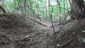 | 津久田砦に通じる切り通しの通路。 | 1郭の堀切と土塁。左側が1郭。 |