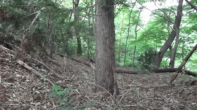 そして尾根を進むとすぐに切岸が見えてきた。それを越えた所がすでに1郭である。長軸20mほどの楕円形の郭となっている。と言っても、削平されただけの平場で、他にはこれと言って目立った遺構はない。先の切岸というのも、高さ2m程度のもので、それだけをもって尾根部分と区画しているのである。通常ならば堀切を入れる所であるのに、それもない。天然の地形に頼り、ほとんどj人工の手を入れていない山城であったようである。