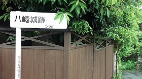 城の中心部を目指して進んでいくと「八崎城 55m」と書かれた看板が目に入ってくる。横に長い看板で右側に空白があるので、これを見たら、右手に曲がっていくのが普通であろう。というわけで右に55m進んでみたのだが、そこは民家の敷地内であり、案内板も何もない。