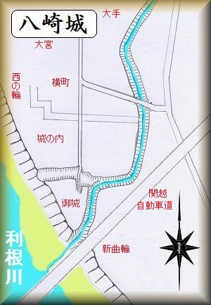 八崎城は、八崎地区の南端近く、利根川に支流が注ぐ部分を中心に築かれていた。南端部分を関越自動車道が通っている。