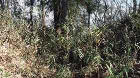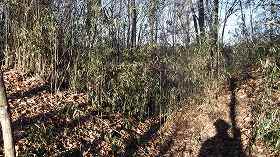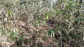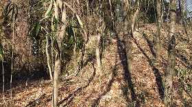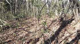 | 山道を進んでいくと、途中に見える腰曲輪。道は7郭まで続いている。 | 2郭から先はひたすら笹ヤブばかりである。写真は1郭内部だが、笹の写真しか映らない。 |
