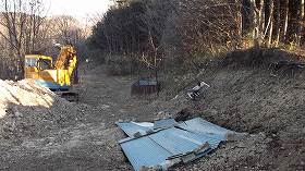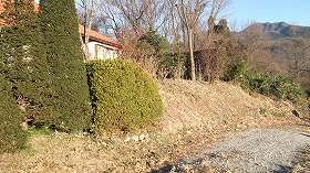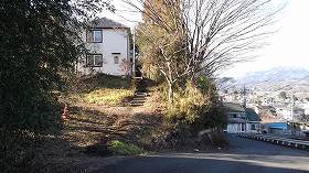 | 北側にある林道入り口。台地上まで車道が続いているが、狭い上に急坂になっているので、車で上がる場合にはかなりの注意が必要だ。 | 1郭の城塁。笹薮でよく分からない。手前の堀も、ほとんど埋められてしまっている。 |