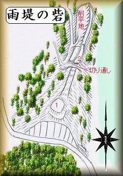 雨堤の砦は、原城の西250mほどの比高20mほどの山稜上にあった。南側を市道が大きく削って切通し状になっている。 砦の南側にある、この切通しは、もともとあった堀切を拡張したものだと思われる。