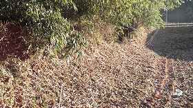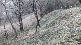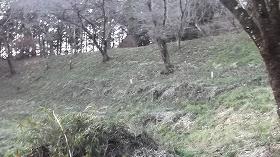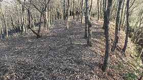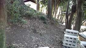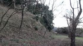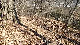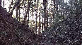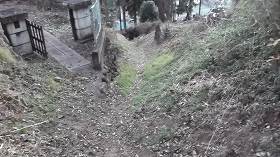 | 南側の切り通し。近代的工事によるものだが、もともと、ある程度堀切状になっていたものと思われる。 | 1郭とその下の腰曲輪。 |