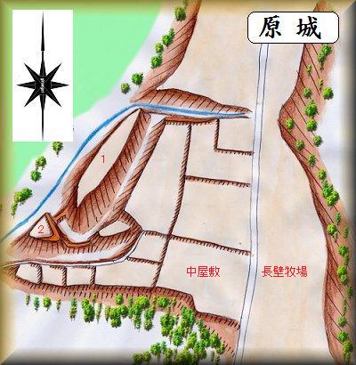 上室田の、長壁牧場のある比高15mほどの台地上が原城の跡である。