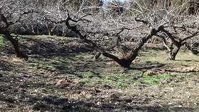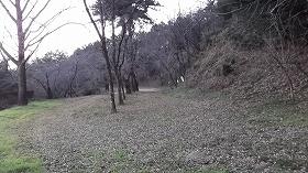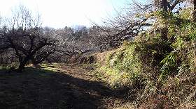 | 林道からいい道を通って本城部分に向かう。脇の10、11郭は梅林となっている。 | 11郭の内部。奥に10郭の城塁が見えている。 |