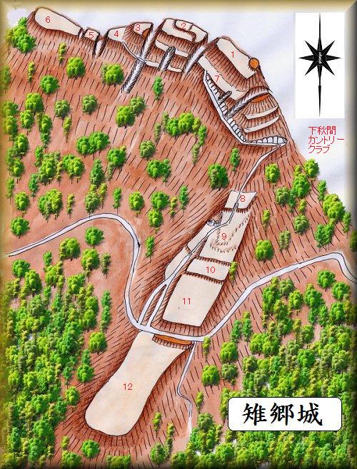 雉郷城は、下秋間カントリークラブの北側にそびえる比高210mの山稜上に築かれていた。高崎市と安中市との境界に当たる部分である。城の中腹の11郭と12郭との間を林道が走っており、ここまで車で来ることができる。