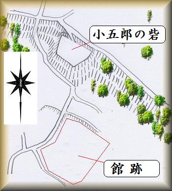 小五郎の砦は、県道406号線の南側で、南側の台地から一段低く北側へ出張った一角に築かれていたという。また、そのすぐ北側の平地部分には館があったという。