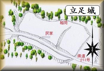 立足城は、市立室田小学校の西300mほどの位置にあった。比高20mほどの台地で、城址を分断するかのように中央部分を県道211号線が通っている。
