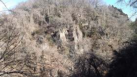 | 対岸の南側から見た湯殿山。岩場に囲まれた険しい山である。 | 北側の2郭南側にある大堀切。実際は旧道として切り開かれたものである可能性がある。 |