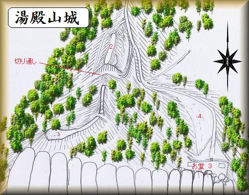 | 湯殿山は、正平13年(1358)、斎藤越前守憲行によって名付けられた山であるという。この年、斎藤氏は、出羽三山に願をかけて、宿敵里見氏と戦って勝利、宿願を達成したので、出羽三山の大権現を勧請して、湯殿山に神社を建立したという。 この伝承では、城郭としての要素はないが、その後、街道を抑える要衝が、湯殿山に築かれたと考えられている。 |