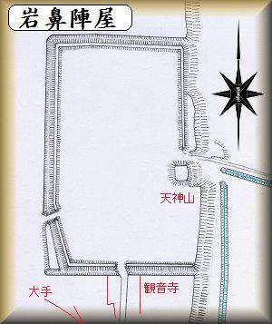 陣屋跡の中心部は広場となっている。駐車場もあるので、車で訪れても安心である。降りてみると、天神社の下に案内板が設置されており、そこに初期と後期の岩鼻陣屋の図が書かれている。初期は天神社から北側だけの規模であったようだが、幕末近くになって南側の部分と、大手枡形とが増設されることになった。右の図は案内板の図に基づいたもので、岩鼻陣屋後期の状態を示したものである。陣屋の規模は、当初は80m×70m、後期は70m×200mほどあった。