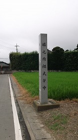 主郭部であったかと思われる部分も民家となっている。その家の前に、石碑が建っていたので、城址標柱かと思って近づいて見ると、そこには「堀之内組式子中」と記してあった。城址標柱ではないが、「堀ノ内」とあるので、ここが城址であったらしいことは一応理解できる。