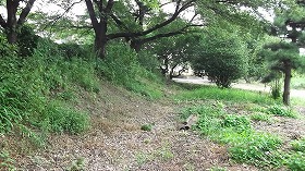 | 天神社の祭られている櫓台。下に案内板がある。 | 東側の城塁と水堀跡。 |