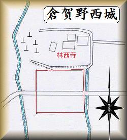 倉賀野西城は、倉賀野町の林西寺の南側にあったという。しかし、この地域は宅地化が著しいので、遺構の残存は望むべくもない。山崎一氏の図から想像するに、図の赤いラインが城址であったらしい。方100mほどの単郭の城館であったようだ。
