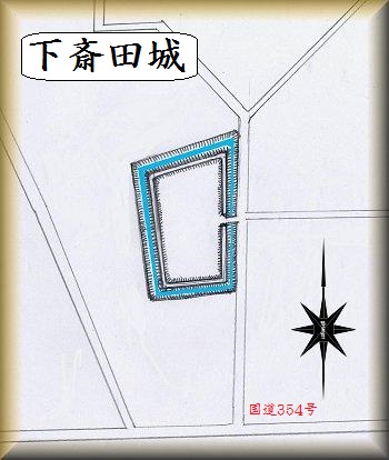 下斎田城は国道354号線の下斎田の信号の北側200mほどの所にある。住宅地のちょっと奥にあるので、脇道に入って行かないと分からないが、航空写真を見ると、その形状をはっきりと見ることができる。現在でも遺構は良好に残されている。