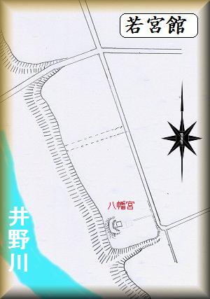 若宮館は、八幡原地区の南端近く、八幡神社の一帯にあった。井野川に望む河岸段丘上であり、西側は断崖地形となっている。