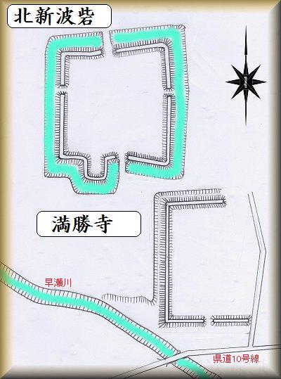 北新波砦に隣接して東南側に満勝寺がある。山崎一氏の図を見ると、この寺院の周囲にはかつて土塁と堀が廻らされ、武装寺院であったらしい。しかし、現在では土塁も堀もすっかり湮滅してしまっている。かろうじて、南側の早瀬川に面する辺りが、なんとなく城館らしい雰囲気を残しているといった程度である。