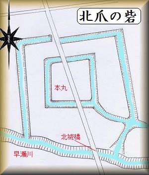 北爪の砦は、県道28号線と10号線とが交差する浜川町交差点の南100mほどの所にあった。航空写真を見てみると、西側の内堀と外堀の跡がくっきりと見えている。右の図は山崎一氏の図と古い航空写真を基にして作成した想像図である。