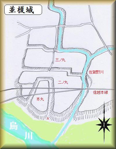 並榎城は、烏川に臨む、上並榎町の西端の河岸段丘上に築かれていた。城址の先端部近くをJR信越本線の線路が分断している。それでも航空写真を見てみると、かつての城の構造を想像することは可能である。右のラフ図は、山崎一氏の図と古い航空写真とを参考にしたものである。