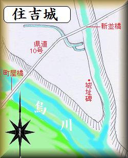 住吉城は、烏川とその支流とが交流する間の、まさに要害地形に築かれていた。現在、遺構らしきものは認められないが、堤防の上のスナックの前に城址碑が建てられている。城址碑の位置はこの場所である。