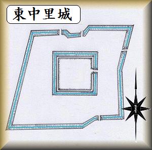 東中里の火雷若御子神社の東側一帯が、東中里城の主郭であった。現在、堀はほとんど埋め立てられてしまっているようだが、古い航空写真を見てみると、右の図のような形状を理解することができる。これがかつての城の形状を示しているのではないかと思われる。
