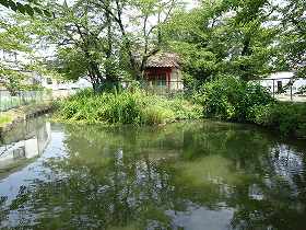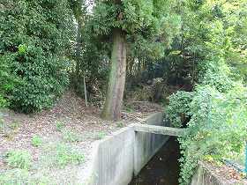 | 環濠集落内にあった弁財天。この池もかつての環濠の名残であったろうか。 | 南西に今も残る環濠のお宅。川に沿って土塁がある。 |