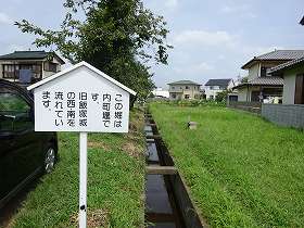 西側から進んでいくと、西側を流れる川に、案内板が立てられていた。そこには「この堀は内町堰です。旧飯塚城の西南を流れています」と書いてある。この小川が、かつての堀であることを示しているのであった。ちなみに、上飯塚城に関する案内板が設置されていたのはこの部分だけで、後は何の案内板もなかった。