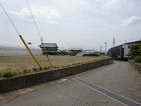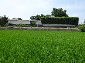 大下屋敷は、群馬県立高崎高等特別支援のすぐ西側の微高地上にあった。東側の特別支援学校の方から見ると、屋敷跡は一段高い地勢にあり、手前の水田がかつての堀跡だったのではないかと思わせる。