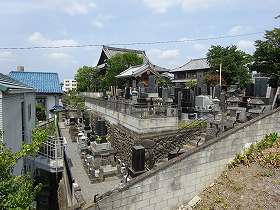 宅地が密集していることと、墓地の造成が進んでいることもあって、地形がかなり改変されてしまっているのだが、城郭的な地形は旧状が理解できる程度に保たれている。城の南側は切岸状の地形になっており、特に本堂の南側下には帯曲輪も造成されている。本堂の西側は墓石が密集状態になってしまっているのだが、それでもこちらに谷戸があったことははっきりと理解でき、これが天然の堀となって背後の守りを固めていたことは明らかである。