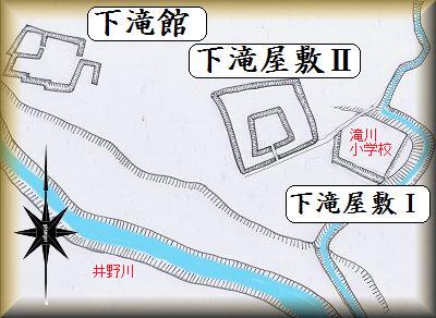 下滝の滝川小学校のある場所と、そのすぐ西側の民家のある場所とに2つの下滝屋敷があった。下滝屋敷Tは、五左衛門屋敷とも呼ばれているようで、何とか五左衛門といった人物の居館であったのではないかと想像される。