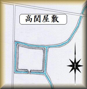 高関屋敷は、国道354号線の高関交差点のすぐ東南側にあった。航空写真を見ると、現在でも屋敷のラインがなんとなく維持されているのが分かる。