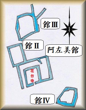 阿佐美館は、合計4つの環濠屋敷の集合体であった。その中心となるのは花台寺のある部分で、二重の堀に囲まれていたようだ。しかし、その堀も埋められてしまい、わずかに寺院の背後にそれらしき溝の跡が認められるだけとなっている。