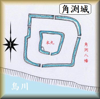 角渕城は、烏川に臨む河岸段丘上に築かれていた。角渕八幡神社の西側一帯である。こちらも、現在はほぼ湮滅状態にある。山崎一氏の図と、古い航空写真を基にして想像図を描いてみたが、どうにもよく分からない。二重の堀を廻らせた環郭式の城館であったようである。