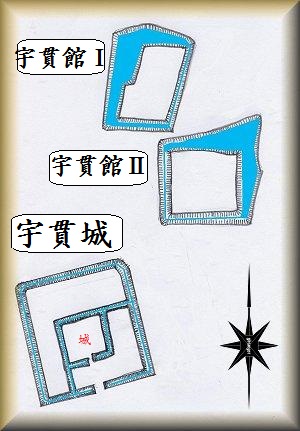 宇貫城に隣接するようにして、2つの単郭の館跡が存在していた。現在は工場の敷地となっており、溝のラインの痕跡すらないが、山崎氏の図を見ると、堀は単に四方を囲んでいるだけではなく、溜め池のように幅広になっている部分もある。かつての郷士の居館で、溜め池を持つことで、水利権の象徴としていたのではないかと推測される(というのは図面を解釈する際の誤りの可能性もあり、実際は、幅広の堀ではなく二重の堀であったかもしれない)。
