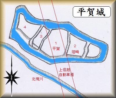 平賀城は上信越自動車道によって真っ二つに分断されており、googlemapの地図を見ると、吉田城跡(廃城)と示されている。吉田城という別称は、参考した資料には掲載されていないが、何にちなんだ名称なのであろう。