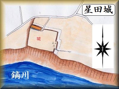 高田川と鏑側とが合流する地点の、鏑川に臨む比高20mほどの断崖上に星田城が築かれていた。航空写真を見ると城塁の方形の区画がはっきり認識できる。