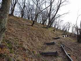 山稜は南側の城址まで600mほど長く延びているので、距離はわりあいあるのだが、それほど急斜面ではない。ヤブもなく歩きやすく15分ほどで城址に到達する。