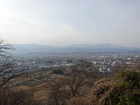 | 城山公園。桜の木がたくさん植えられている。ヤブがなく気持ち以外井遊歩道だ。 | 山上から遠望する富岡市街。なるほど、眺望もよく、烽火を挙げるにはよい場所である。 |
