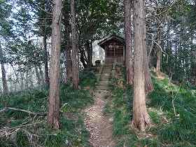 それを登るとやや傾斜した平場となり、その先に金毘羅神社の祭られた土壇が見えてきた。ここが砦の中心部分である。