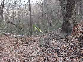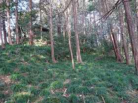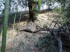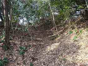 | 1郭内部。傾斜した地形である。 | 1郭先端下にある腰曲輪。 |