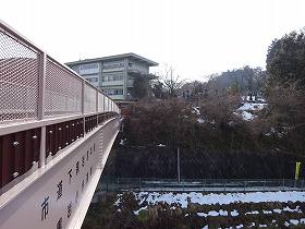| 黒岩小学校への歩道橋。右手奥に城址が見えている。これを渡って墓地の中を進んでいくと登城道となる。 | 墓地の奥にある登城道スタートの案内。小学生が作成しているのが微笑ましい。 |