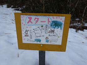 渡った先は墓地になっているが、墓地の間を抜けて行くと、何やら看板のようなものが見えている。近づいてみると、それは小学生が立てた案内板で、スタート地点を示すものであった。いずれにせよ、小学生がこのような看板をつくってくれているというのは何とも微笑ましいことである。どうやら、城址付近には山道が付けられ、小学生のオリエンテーリングの場所になっているらしい。ちなみにこのルートは「イノシシコース」と呼ばれているようで、登り口は他にもいくつかあるようだ。