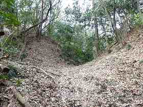 | 1郭内部。祠が一基置かれていた。また、西側は土塁状に高くなっている。 | 2郭土塁北側の堀切。きれいな形状をしている。この右手の下方には土塁を伴った小郭がある。 |